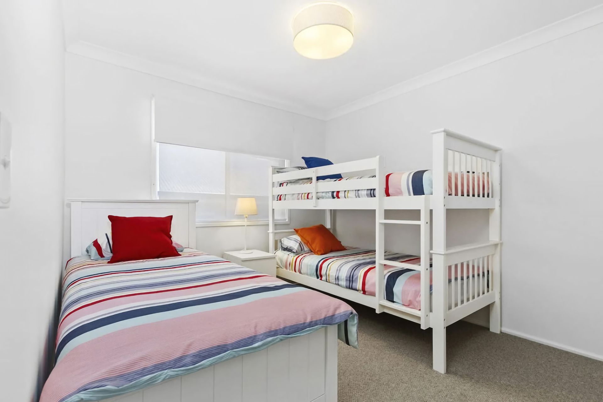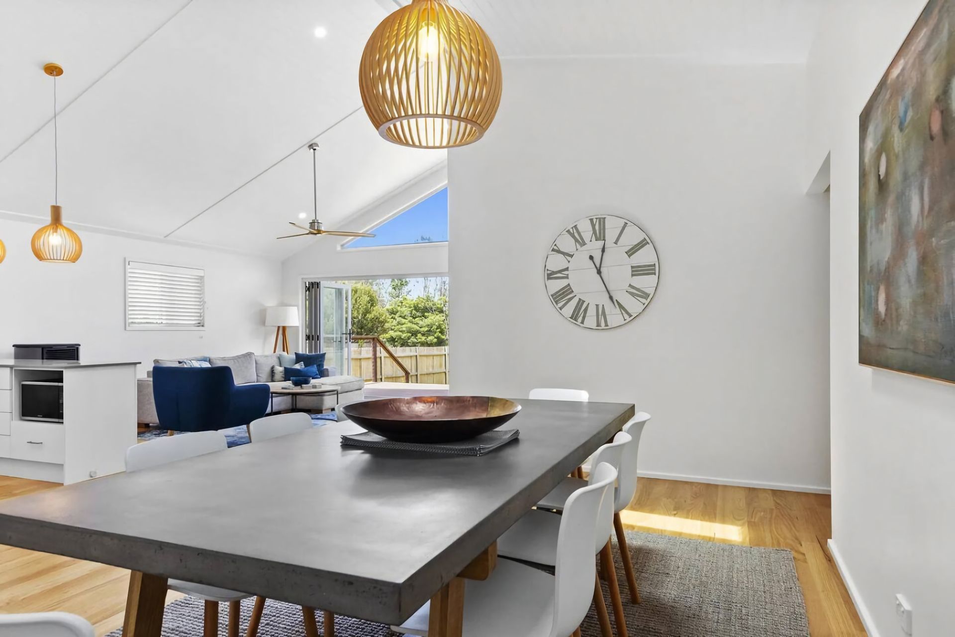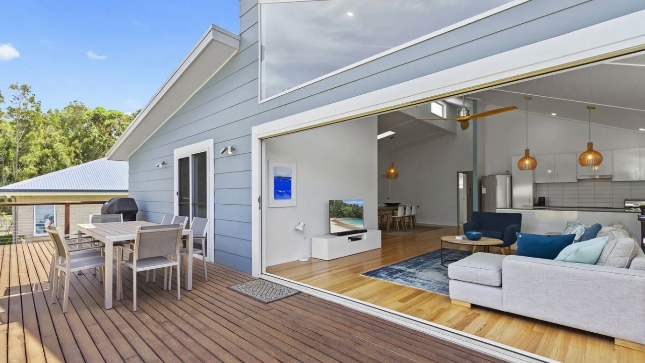 Modern, light and airy with high ceilings to let the air floor through the full opening sliding doors from the entertaining area, this lovely home has 4 bedrooms including 2 queen rooms and 2 bunk rooms as well as 2 bathrooms, all tied in beautifully with an open plan living room, dining room and kitchen.